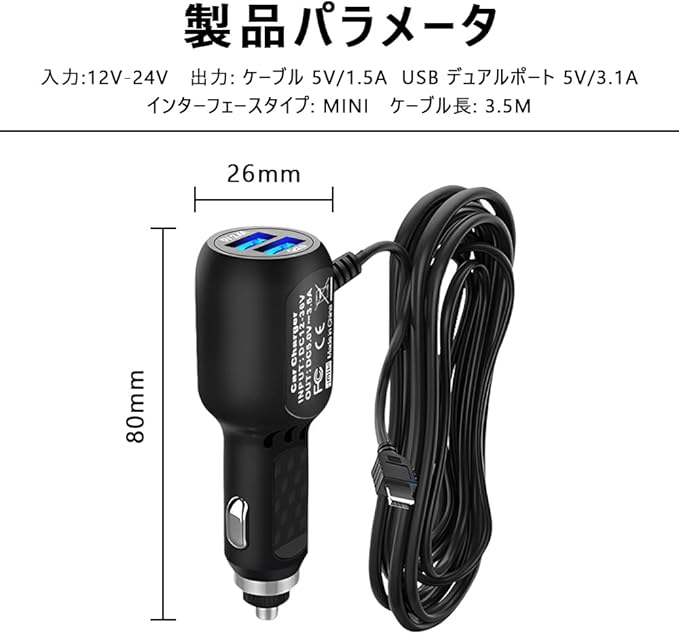 シガー電源アダプター ドライブレコーダー用電源ケーブル 3.5M mini-USB 1.5A+3.1A 12V/24V対応 ドライブレコーダー GPS タブレットPCなどに最適な充電器
