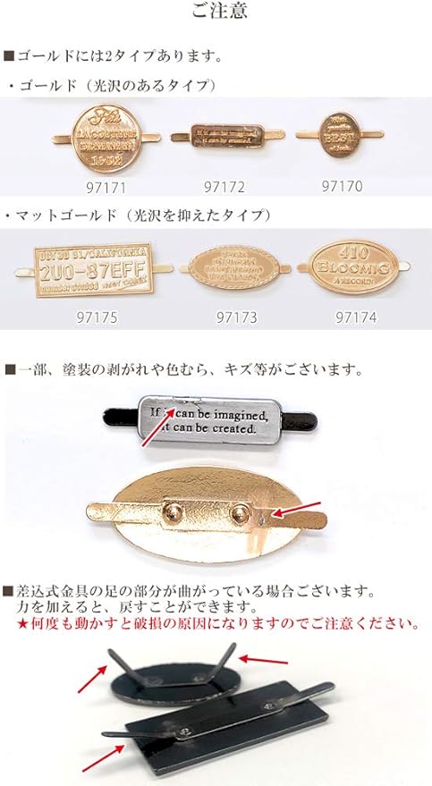 差込金具の足の部分を何度も折り曲げると破損の原因になります。ご注意ください。差込金具の足の部分をメタルタグ本体をかしめている接続部分が浮いている場合がございます。表面に擦れやキズ、色むら、接続部分に接着剤や かしめているの部分のズレなどがある場合がございます。生産過程上、避けられない仕様となります。