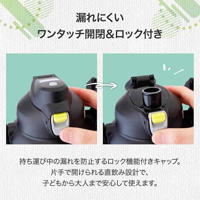 【ワンタッチ開閉&ロック付き】 持ち運び中の漏れを防止するロック機能付きキャップ。片手で開けられる直飲み設計で、子どもから大人まで安心して使えます。