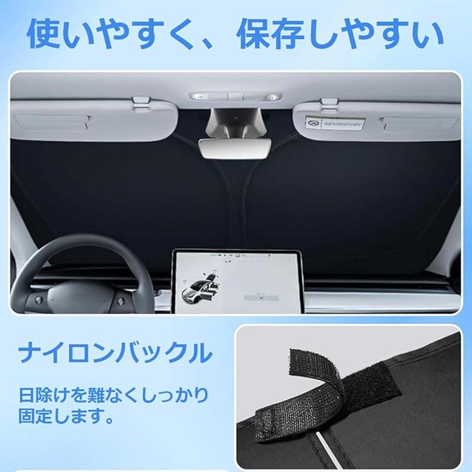 【簡単装着・収納可能】:構造簡単で、吸盤を使わず、誰でも簡単に取り付ける可能です。本体を広げて下部をフロントガラスに押し当て、サンバイザーを下げて固定するだけで装着完成。また、収納袋があります。折り畳みでコンパクトに収納可能です。場所を取らない。
