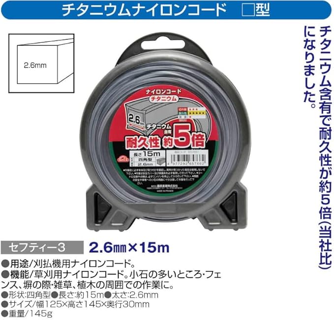 セフティー3(Safety-3) 草刈・刈払機用 耐久性約5倍 チタニウムナイロンコード 15m 四角型 2.6mm径