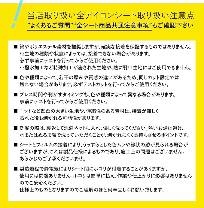 ●ニットなど凹凸や伸縮性のある生地は接着しにくく、剥がれる可能性があります。●洗濯は裏返してネットに入れ、熱湯を避け水またはぬるま湯で優しく洗うと長持ちします。●シートとフィルムの接着により色ムラや線状の跡が出る場合がありますが、仕様によるものとなります。●ご使用はお客様の判断と責任でお取り扱いをお願いします。●ご不安な方は約A4サイズの商品からお試しご確認ください。
