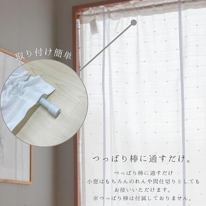 突っ張り棒に通すだけで小窓や棚の目隠しとしてご使用いただけます。フラットやヒダを寄せてのご使用もしていただけるのでお好みに合わせてご使用ください。※突っ張り棒は付属しておりません。