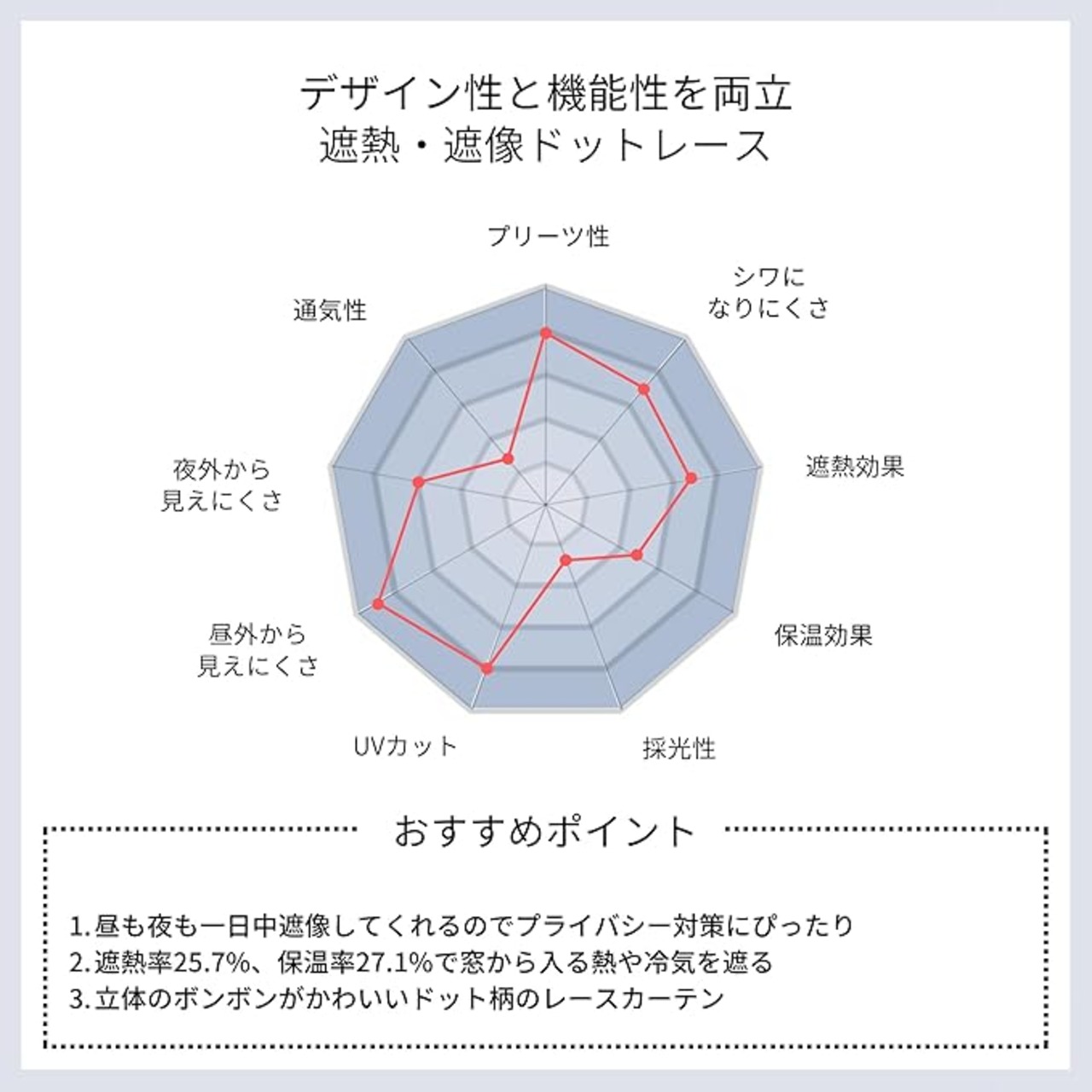 【遮熱効果25.7%・保温効果27.1%】窓からの熱や冷気を遮ることでお部屋の温度の上昇、低下を抑えることができます。夏は涼しく冬は暖かいレースカーテンです。