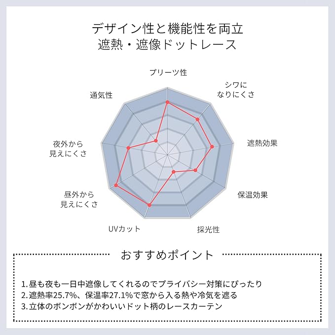 遮熱効果25.7%・保温効果27.1%.窓からの熱や冷気を遮ることでお部屋の温度の上昇、低下を抑えることができます。夏は涼しく冬は暖かいレースカーテンです。