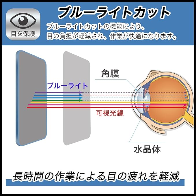 2:ブルーライトカット率:48% 紫外線カット率:99%。長時間の作業による目の疲れを軽減。