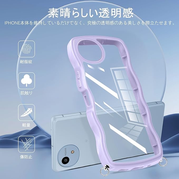 AQUOS Wish4 ケース クリア ショルダー ストラップ付き Aquos Wish 4 SH-52E ケース カバー かわいい 波状フレーム 人気 耐衝撃 透明 アクオス Wish4 スマホケース 首かけ 肩掛け TPU 薄型 軽量 ワイヤレス充電対応(パープル)