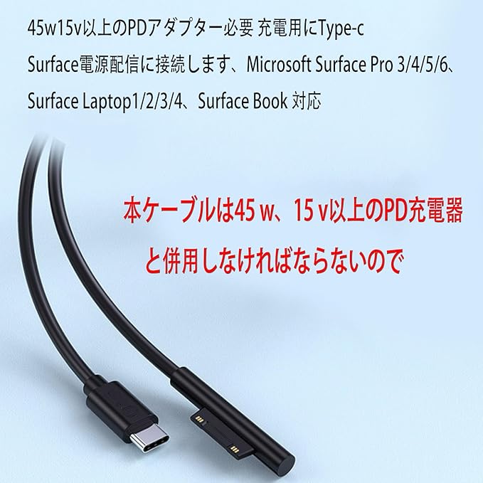 【高速充電】Typec-Surface PD高速充電、15V/12V対応15V4A。対応機種:Microsoft Surface pro 3/4/5/6 、Surface Laptop1/2/3/4、Sruface Book1/2、Surface pro Go。