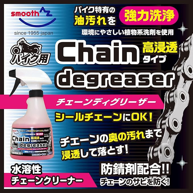 チェーンのサビを防ぐ、防錆剤入りです。また、植物系洗剤のため、環境にもやさしい。