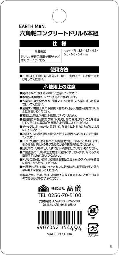高儀 EARTH MAN 六角軸 コンクリートドリル 6本組