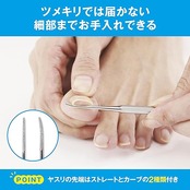 カーブとストレート2種類の先端形状でツメキリでは切りにくい細部までお手入れ可能。