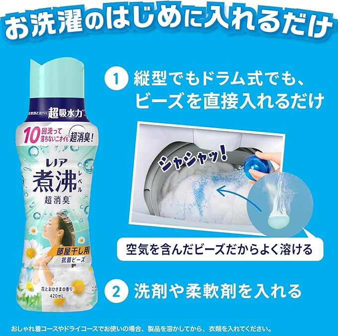 使い方は簡単。洗濯前に洗濯槽に直接入れるだけ。縦型・ドラム式、どちらの洗濯機にも使用できます。いろいろな柔軟剤とも香りの相性バツグンです。