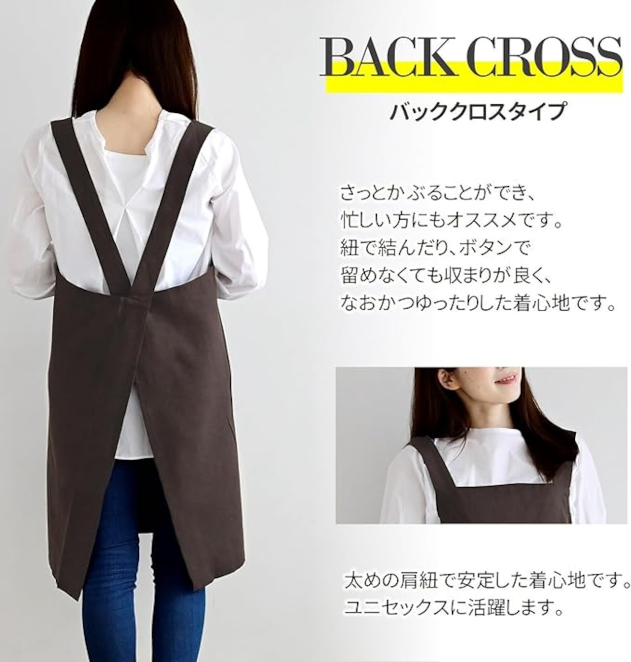 着用が楽ちんなかぶるだけのバッククロスタイプのエプロンです。シンプルなカラーの無地デザインなので、お洋服を選ばずに、ユニセックスアイテムとしてもおすすめです。