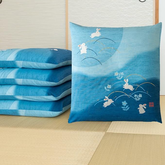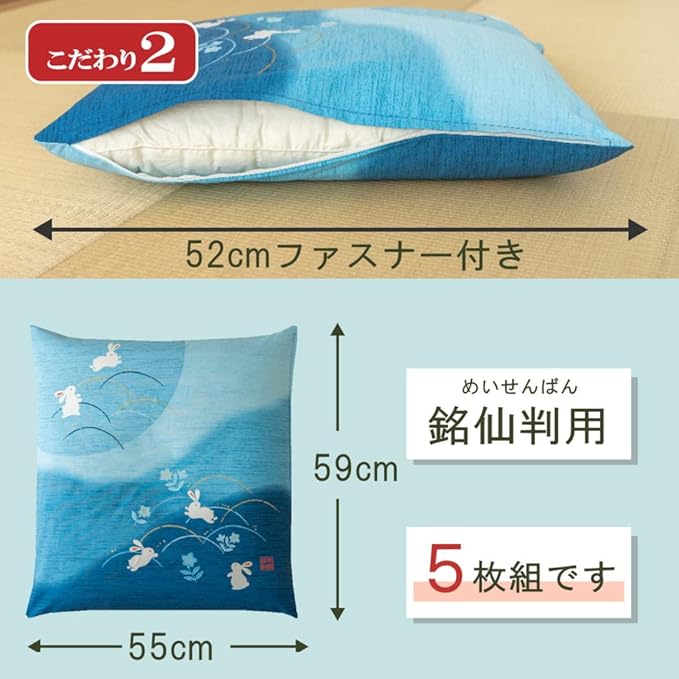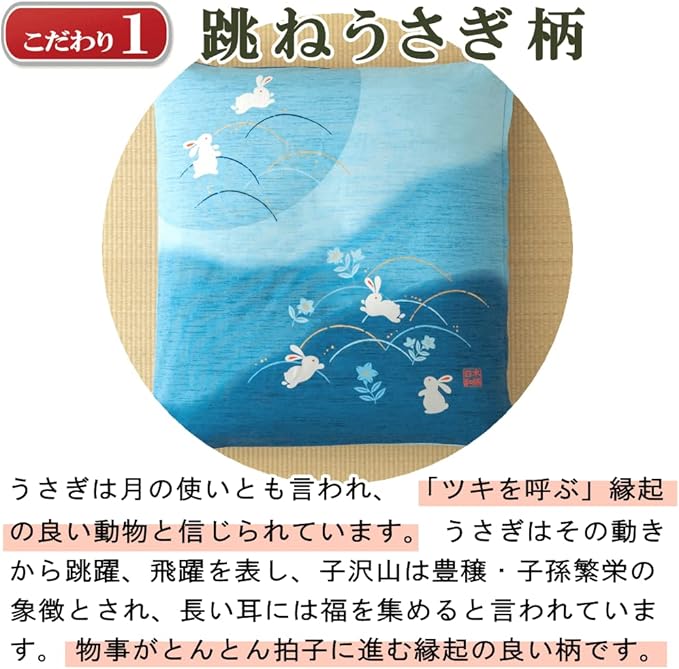 ■繊維の街、愛知県東三河地方蒲群市で生地の染工から縫製パッケージまで全て国内で仕上げた日本製です。伝統ある確かな技術で1枚1枚丁寧に仕上げています。■縁起の良い柄をプリント。うさぎは月の使いとも言われ、「ツキを呼ぶ」縁起の良い動物と信じられています。 うさぎはその動きから跳躍、飛躍を表し、子沢山は豊穣・子孫繁栄の象徴とされ、長い耳には福を集めると言われています。 物事がとんとん拍子に進むと伝わる縁起の良い柄です。■大口ファスナーで出し入れが楽です。■ご家庭でも簡単にお洗濯が可能ですのでいつでも清潔を保つことができてとても衛星的です。本体重量(1枚)約110g、綿100%生地を三河地方で縫製した耐久性抜群の座布団カバーです。