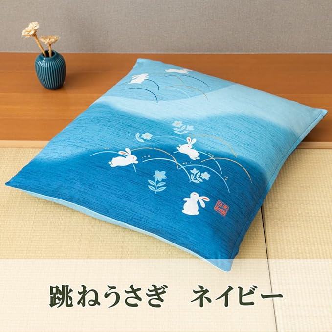 HAPPY SINGU RABO 【 日本製 】 座布団カバー 綿100% 【跳ねうさぎ】 【物事がとんとん拍子に進むと伝わる縁起の良い柄】 ざぶとん カバー 三河産 和室 洋室 来客用 普段使い 業務用 飲食店 業務用 公民館 集会所 来客用 法事 会議室 (ネイビー 5枚組)