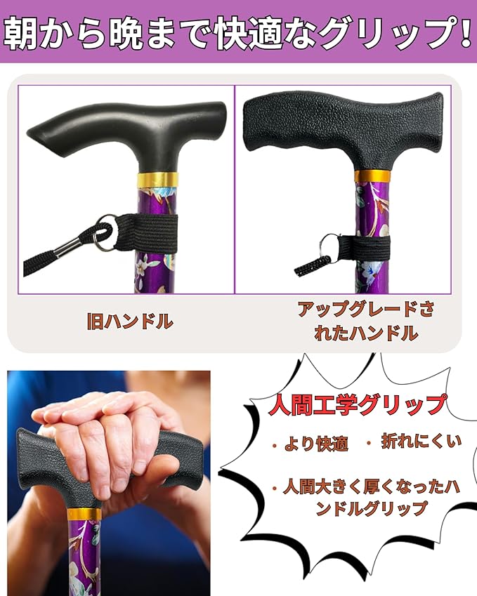 【花柄折り畳み式杖-軽量】耐久性のあるアルミニウム製。 バージョンアップ版のスティックの重さはわずか270gですが、頑丈です、日常生活では安定して使えます。非常に軽量で、鞄の中に入れても重みを感じることなく、楽に持ち運びが可能です。持ち運びに便利な折り畳み式の杖です。女性は持ち運びや使用が簡単です。
