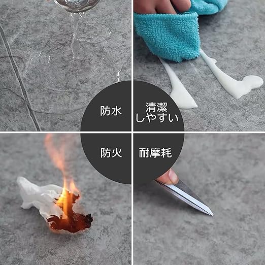 ✿【防水耐久性】フロアタイル表面には耐久性に優れた特殊クリア加工・抗菌加工に加え、防水、表面についた汚れは濡れ雑巾などでふき取ってください。滑りにくいです。