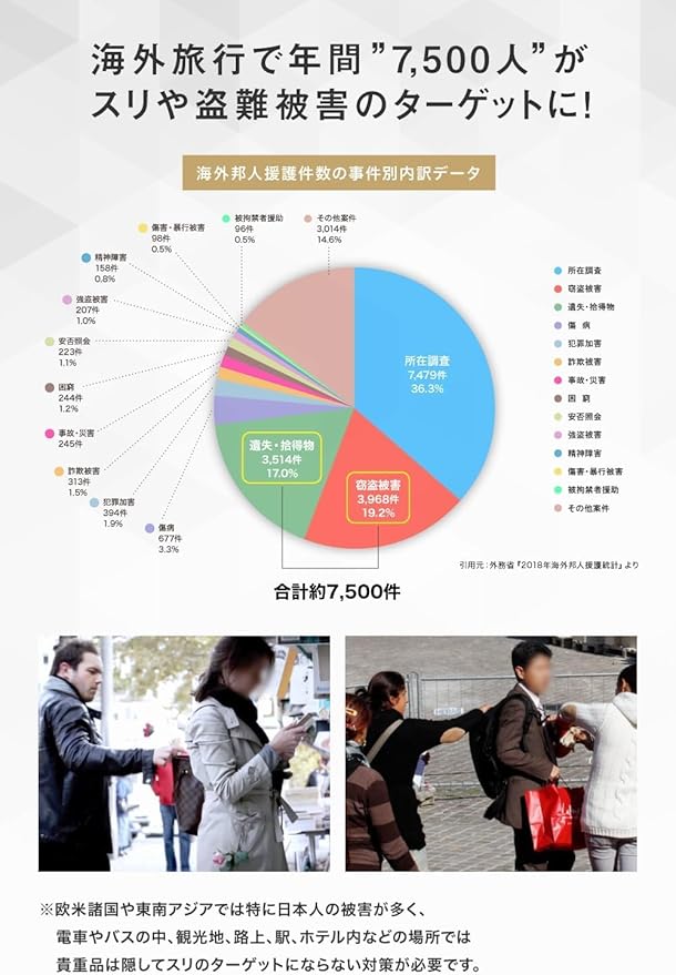 【薄くて軽くてしっかり隠せる】:1.3cmの薄型設計のため服の中にも隠しやすく、外からも着用が分からない防犯スマートデザイン。 【貴重品を守るための設計】:(1)スキミング防止機能(※フロントとメインポケットが対象、背面メッシュポケットは対象外)(2)撥水性の高い高級ライクラ素材(3)高品質YKKジッパー を採用し、使うたびにその安全で快適な機能性を実感できるスペックに。