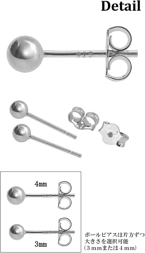 商品データ ・商品番号 [STL-P01-3-4] ・素材 シルバー925 ・重量 約0.2~0.3g(1個あたり) ・ボールの直径  約3mmまたは約4mm ・ポスト太さ 約0.7mm (21G)
