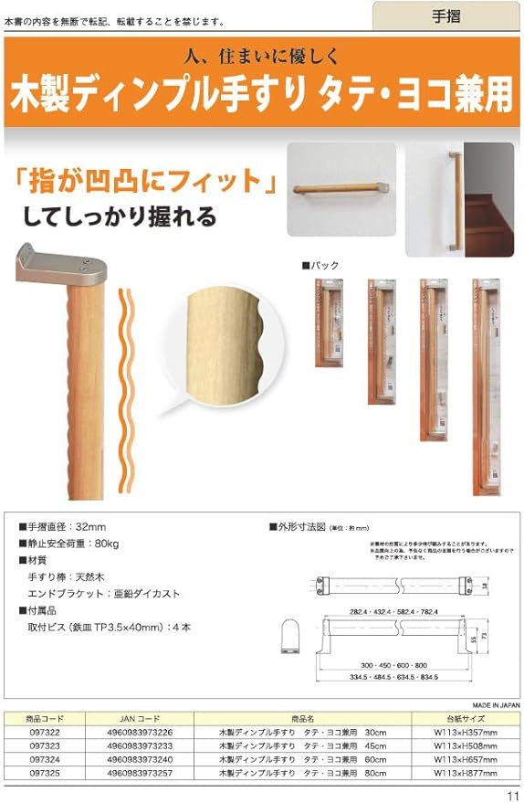 手すり径32mmの天然木にディンプル(凸凹)加工をほどこし握りやすく、滑りにくい手すり棒に仕上げました。カットして長さを調整できます。タテヨコ兼用のてすりです。