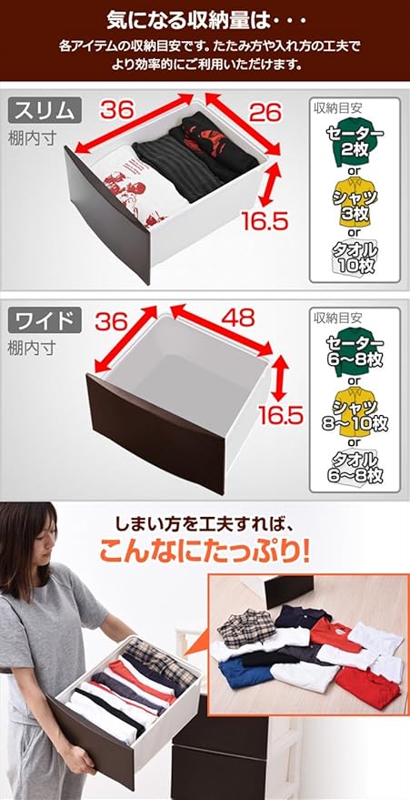 1段あたりの収納目安:セーター2枚、Yシャツ3枚、タオル10枚