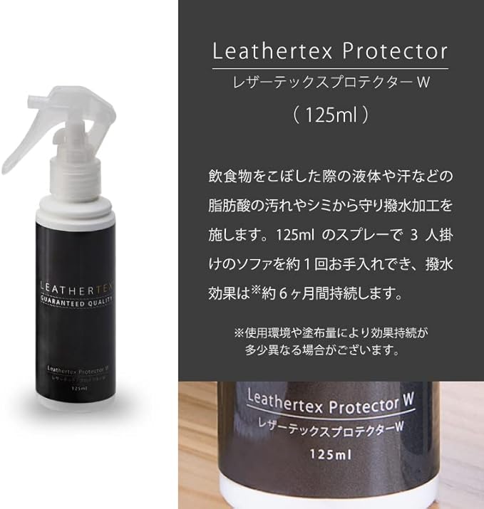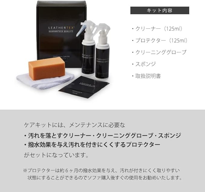 【クリーナー】汚れがついてしまっても簡単にクリーニングできます。【プロテクター】クリーナーでのクリーニング後に撥水加工が出来ます。乾燥後(約1時間後)には製品をすぐにお使い頂けます。プロテクターの撥水効果はお使いのソファの使用方法にもよって異なりますが。7か月~1年を目安として、水滴実験などをしてご確認下さい。【セット内容】レザーテックスクリーナー(125ml) 1、レザーテックスプロテクター(125ml) 1