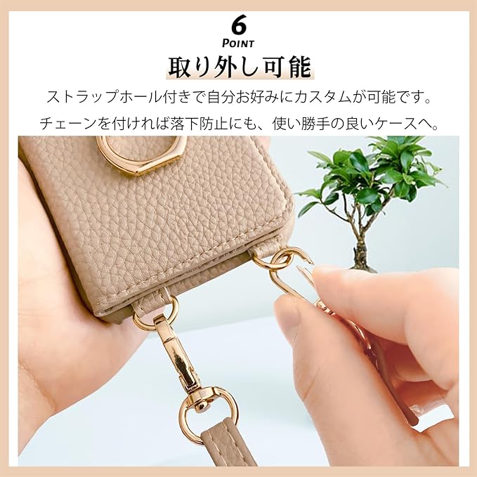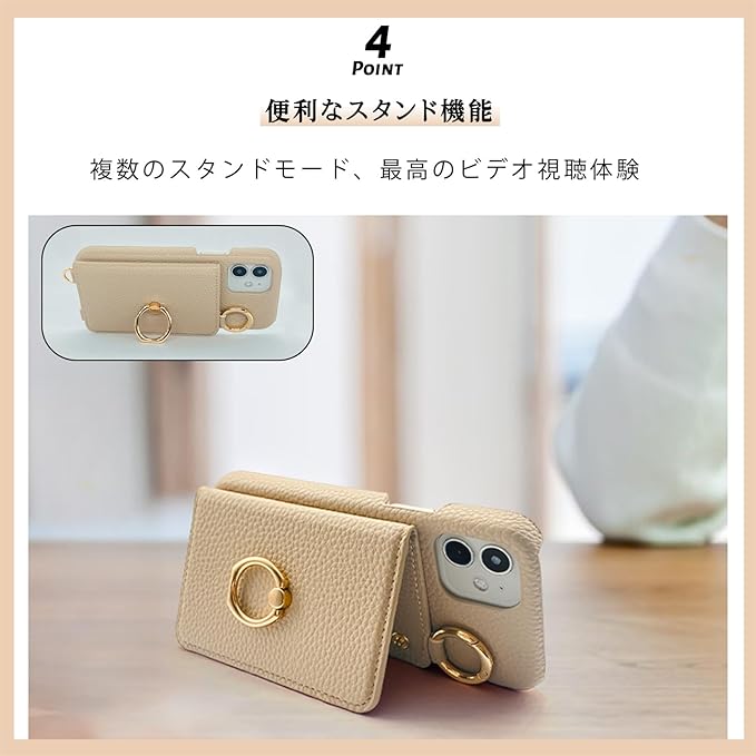 カード入れ・リング付 ・鏡・ショルダーストラップ付きのiPhoneケースです、携帯ケースiPhone13、iPhone 13 ショルダー。iPhone13背面手帳型。iPhone 13 紐付きケース。なんといってもショルダーストラップ付き、落下の心配や紛失の心配もありません。まるで本革のような上質なPUレザーでおしゃれを楽しむ大人女子にピッタリなアイテム。もちろんケースは衝撃吸収設計、衝撃からスマートフォン本体を保護します。内側はマイクロファイバーで本体を傷つけにくい起毛素材となっています。触り心地が良くiPhoneの背面への子擦り傷を防げます。長さ自由自在調整、ショルダーストラップ付き、肩掛けしたまま操作可能。スタンド機能付き、ポケット部分を立てるとスタンドに!動画視聴などとっても便利。