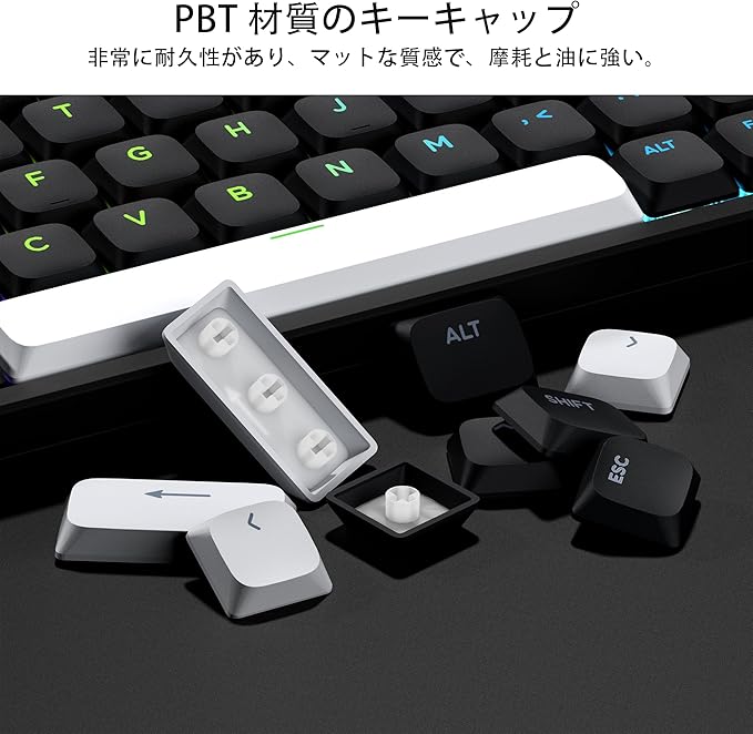【ダブルショットキーキャップ】これらのキーキャップは、印刷なしで互いに成型された2層のPBT材料で作られています。このキーレジェンドは決して剥がりません。ダブルショットPBTキーキャップは持続的な使用でも耐久性が高く、光沢のついた汚れがなくなります