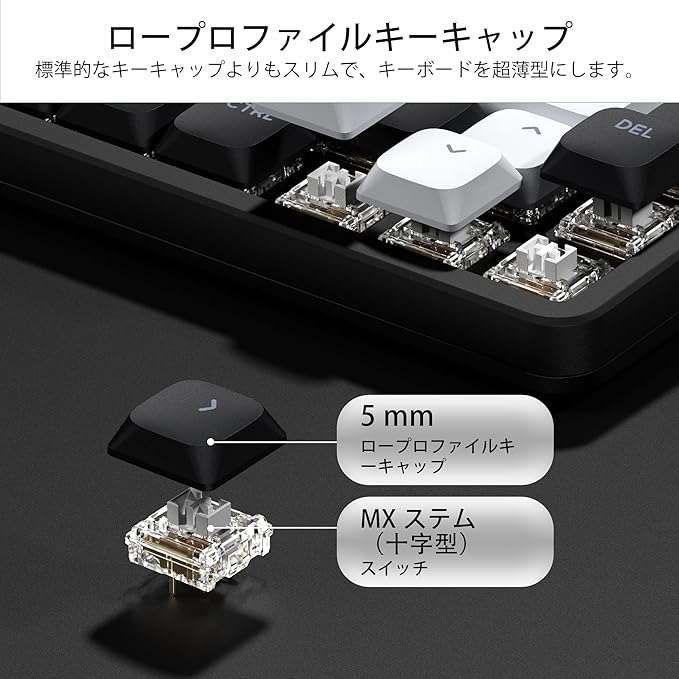 【低プロファイルキーキャップ】このキーキャップの軸は、従来の高さのキーキャップよりも短いですが、従来の高さのスイッチや低い高さのスイッチにも合います。低プロファイルキーキャップは、キーボード操作時に究極のタイピングとゲーム体験を提供するように設計されています