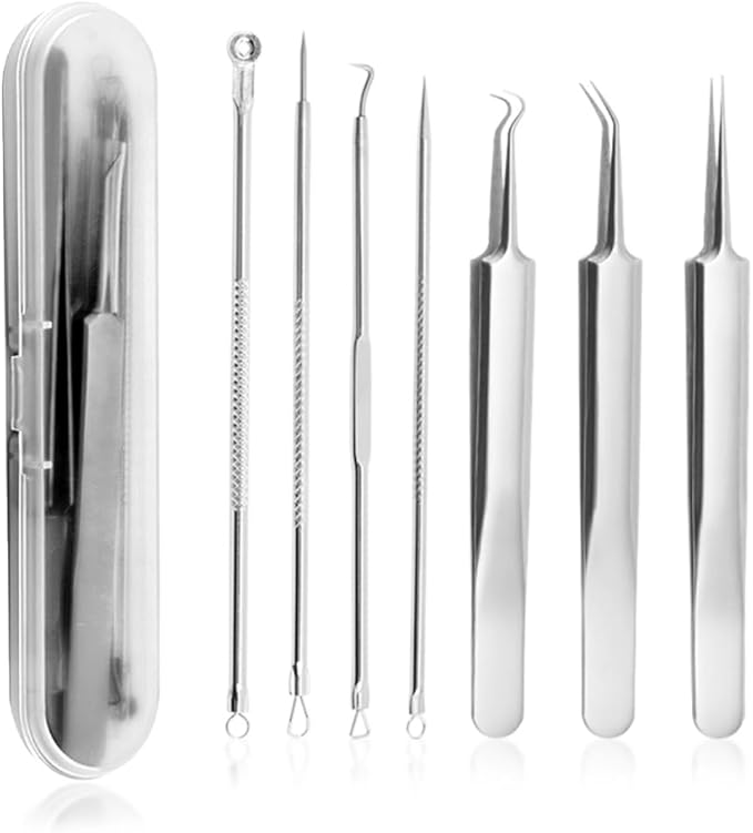 【7本セット】ニキビ取りツールは色々な用途に適しています。顔、鼻周りなどの角栓、黒ニキビ、白ニキビの除去に使用する専用スティックセットです。ニキビや黒ずみだけでなく、毛抜きとしても使用できます。
