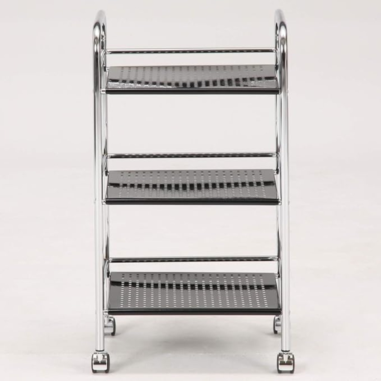 ●シンプルでマルチに使えるスタイリッシュワゴン●シルバーフレームで統一されたシンプルなデザインで、キッチン、洗面所、寝室などお好きな場所で活躍します。●幅36.5 奥行31cmの棚板が3枚あり、1枚の耐荷重が約5kg。●これ1台でたっぷり収納できます。●幅40 奥行32cmのコンパクトサイズなので、ちょっとしたスペースに収まります。●パンチング天板を使用しているので、熱もこもらず、家電製品などを置いても安心です。●棚板にはコの字型にサポートバーが付いており、落下防止として役に立ちます。●また、ちょっとした軽いものを引っかけておくのにも便利。●キャスター付きで移動がラクラク。●掃除もしやすく衛生的です。