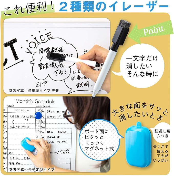 着脱式ペントレー、マーカーペン(黒)、イレーザー(マグネット付き)、マグネット4個を付属しているので、設置後すぐに使用することができる。