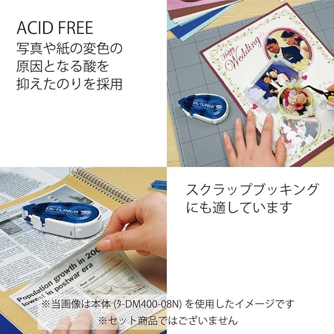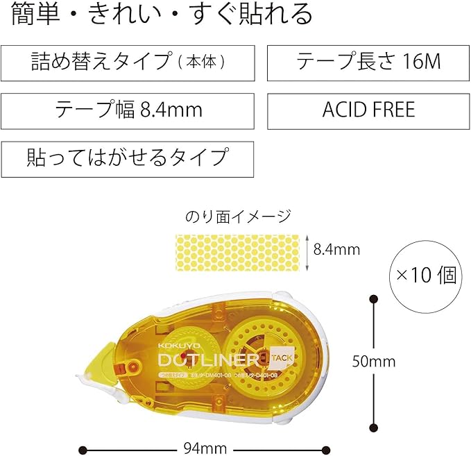 手を汚さずに簡単接着できるテープのり「ドットライナー」本体、貼ってはがせるタイプの10個セット。