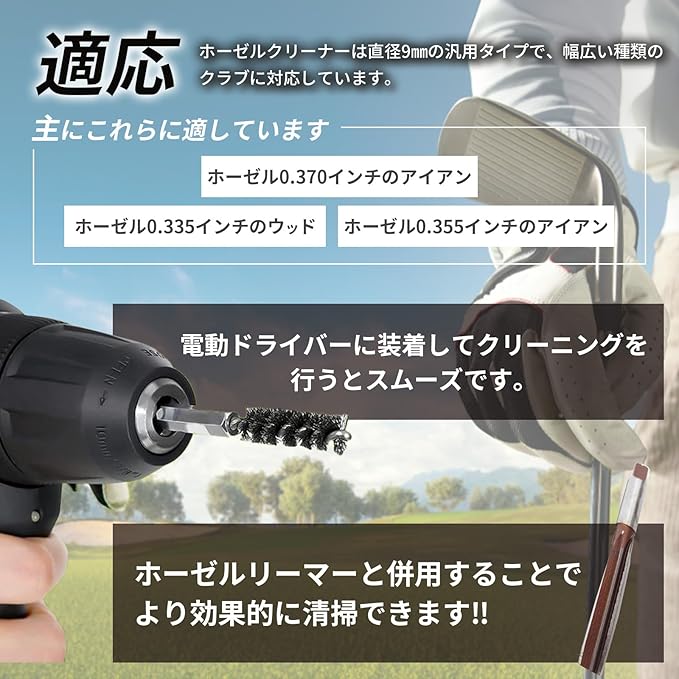 本商品はリシャフトの際にホーゼル内を清掃するのに最適なブラシです。ホーゼル クリーナーはブラシ部分直径9㎜の汎用タイプで、幅広い種類のクラブに対応しています。ホーゼル0.335インチのウッドや0.355インチ、0.370インチのアイアン等に適しています。電動ドリルに装着してクリーニングを行うとスムーズです。