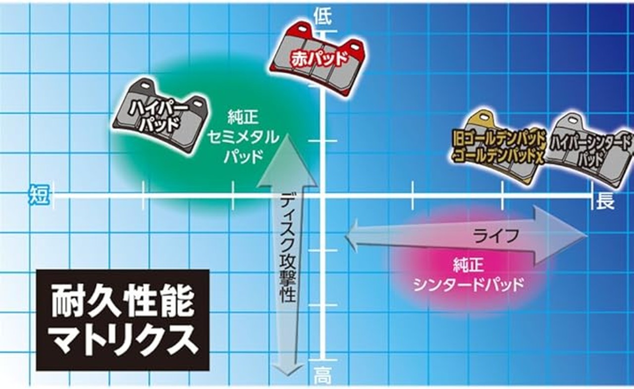 【仕様】従来品と比べ、耐久性は同等ながらも、ブレーキコントロール性と効力(制動力)を向上させました。
