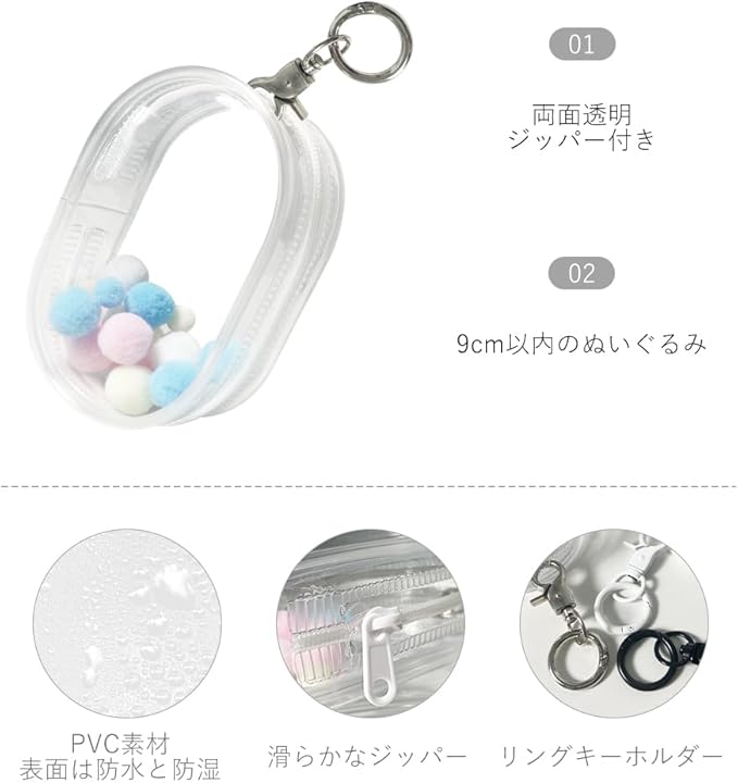 [YUYAKESHI] 痛バ ケース 人形入れ クリア キーホルダー付 ぬいポーチ お出かけ 両面透明 防塵 推し活 ジッパー式 ミニ ポンポンボール付 2個