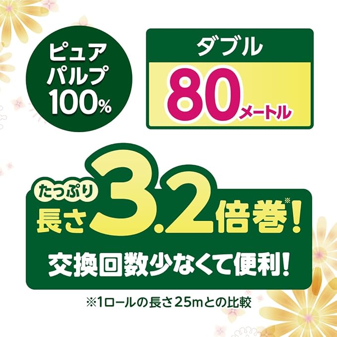 ●1ロール3.2倍巻のたっぷり長持ち。 ※1ロールの長さ25mとの比較。 ●トイレットペーパーの交換や保管スペー スを減らせます。 ●握りやすく、開けやすい取っ手形状。 ●ふっくら巻き取り技術で、長く巻いても柔 らかな肌触りを実現。 ●華やかなフローラルの香り。 ●通常巻24ロール分以上※の大容量。 ●パルプ100%。