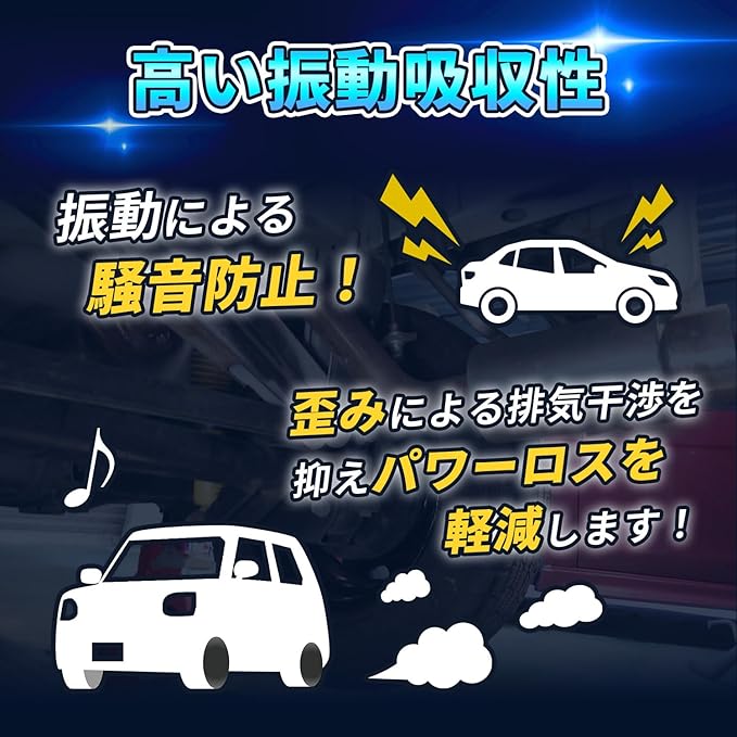 本商品は吊り下げ穴を4ホール搭載することで愛車に合わせた高さ調整が可能。排気管と本体の高さとの接触面積を減らすことで、排気管の騒音や振動発生による騒音を効果的に減らし、排気干渉を抑えることで車のパフォーマンス向上につながります。