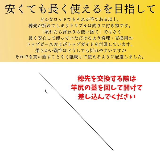 【修理ピース付き】万一穂先が折れてしまった場合でも修理できるように、交換用のトップピースとトップガイドを付属。