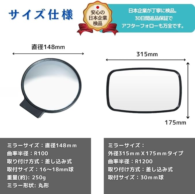 【アンダーミラー仕様】・サイズ:直径148mm・曲率半径:R100・取り付け方式:差し込み式・取付サイズ:16~18mm球・重量(約): 250g・ミラー形状: 丸形【日本国内検品済】安心の日本企業が企画開発・検品・販売・サポートを行っております。 出荷前には、専任スタッフが入念な検品を行います。 日本HOTだからこそ、きめ細かなアフターサービスを提供いたします。購入後30日間の返品返金可能です。購入後の不明点や不良など、すぐに対応します。