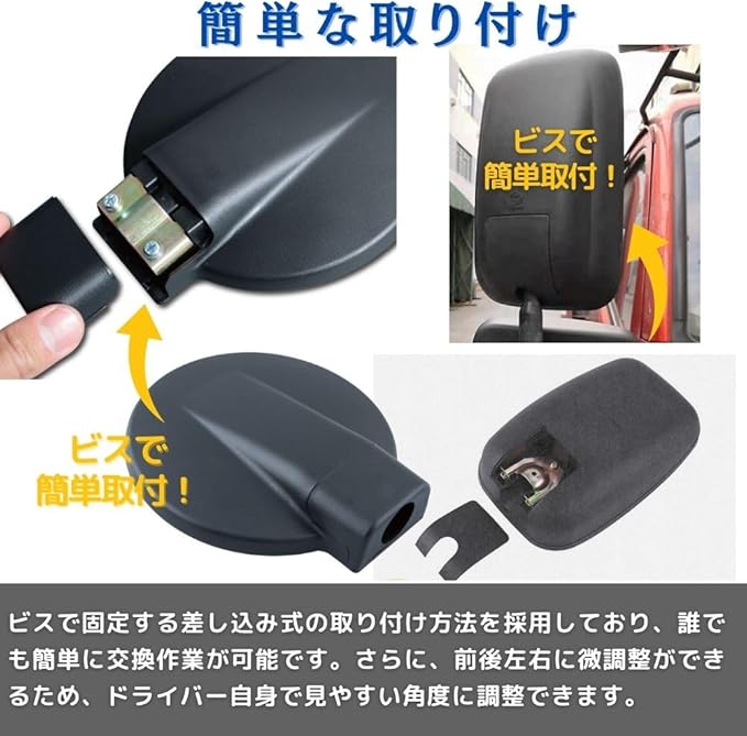 【簡単な後付け取り付け】ビスで固定する差し込み式の取り付け方法を採用しており、誰でも簡単に交換作業が可能です。さらに、前後左右に微調整ができるため、ドライバー自身で見やすい角度に調整できます。