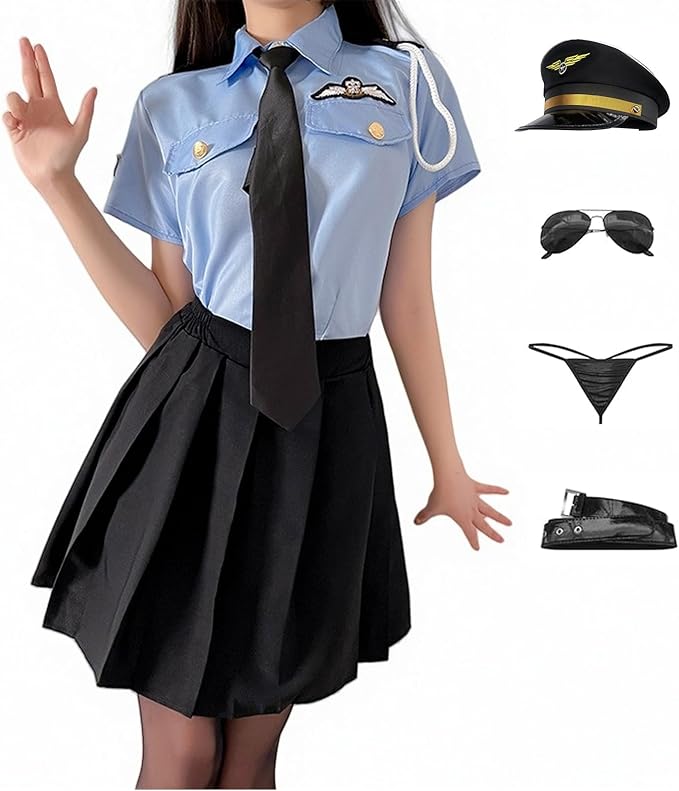 【豪華的なセット】トップス、スカート、ネクタイ、帽子、サングラス、ベルト、Tバックのフルセットです。シンプルでありながらも洗練されたポリスコスチュームです。大人気のポリスコスプレ衣装です!セットの服とアイテムを着れば、キュートでセクシーな警察官に即変身できます