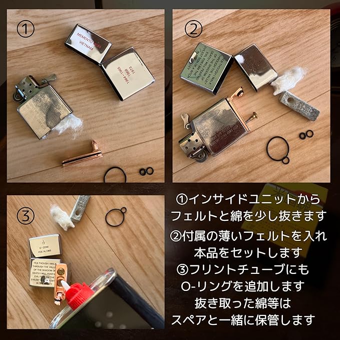 ジッポライターのインサイドユニットに合わせて作られた、オイル揮発防止の為の交換部品です。フェルトと交換してお使い頂く事も、中の綿を少し抜いてフェルトの上からお使い頂く事も出来ます。