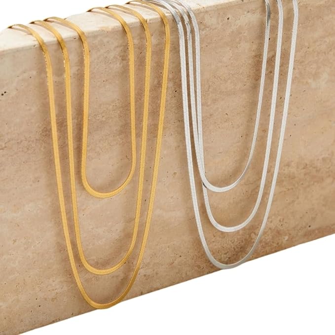 デザイン性: 異なる長さのスネークチェーンを組み合わせた3連デザイン。洗練された重ね付け効果を一本で実現