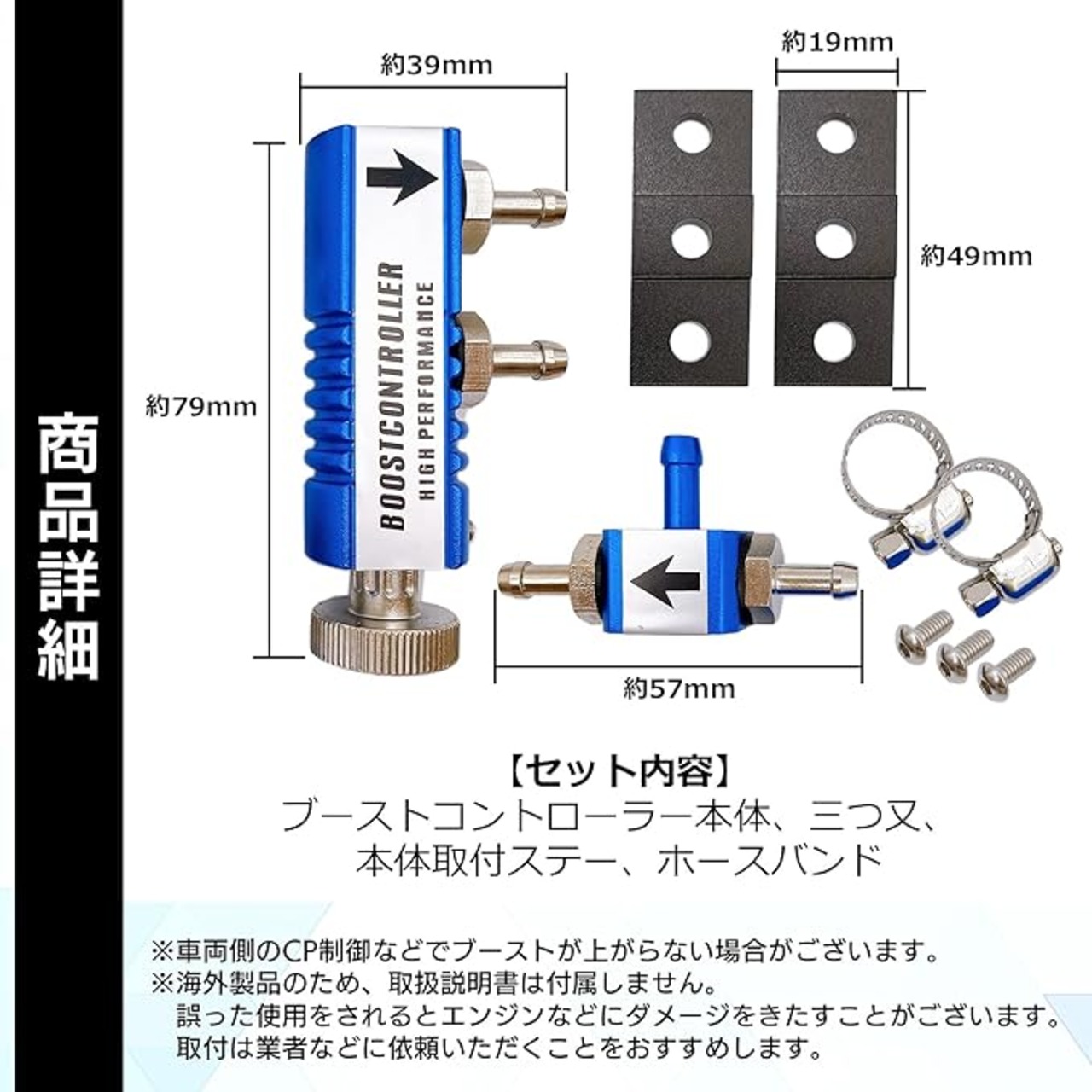 セット内容 ・VVCコントローラー本体 ・ブースト計用三つ又アタッチメント ・本体取付ステー ・ホースバンド ・ボルト ※ホースは付属しません。