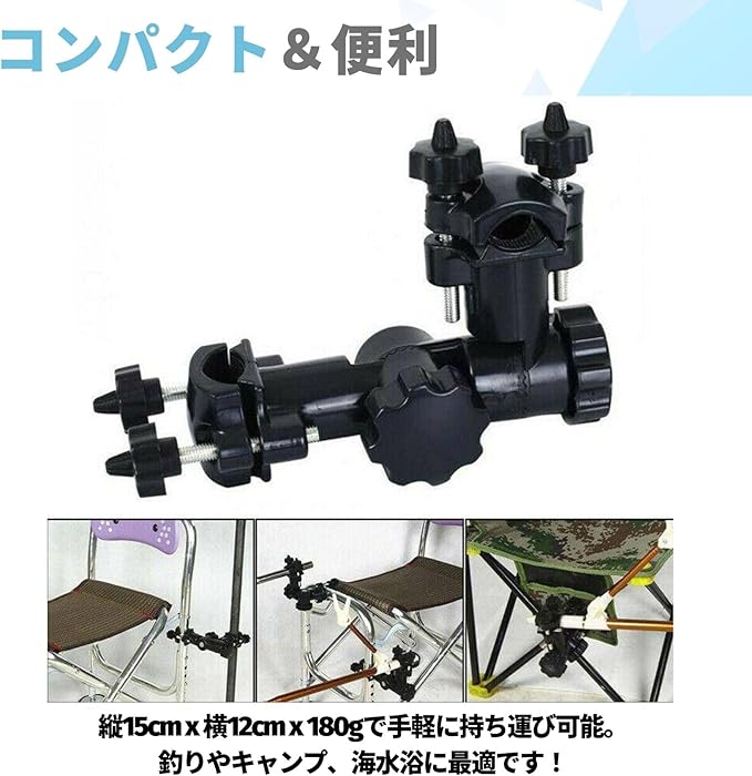 【持ち運びに便利なコンパクトサイズ】 このパラソルスタンドは縦15cm、横12cm、重量180gとコンパクトで、持ち運びがとても簡単です。折り畳みチェアや様々なレジャー用品に取り付けられ、アウトドアでの活動をさらに快適にします。