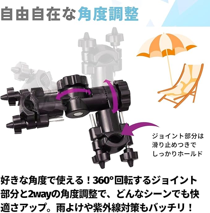 【高品質で頑丈なパラソルホルダー!】 このパラソルスタンドは、高品質ABS製で作られており、耐久性があります。ジョイント部分は360 回転し、どんな角度でも固定可能です。しっかりとしたホールド力があり、安心して使用できます。