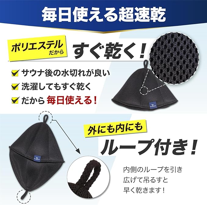 ✅【使って、洗って、すぐ乾く】汗をかいても、洗濯しても、あっという間に乾くサウナハット。従来のタオル生地のように重くならず、面倒な手入れも不要。毎日のサウナ通いをもっと楽しく、もっと快適にする魔法のようなアイテムです!