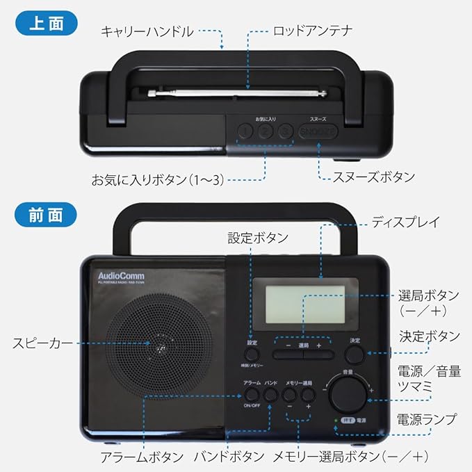 ◆デジタル時計付き、アラーム(スヌーズ機能付き)とスリープ(自動電源OFF)設定もできます。アラームはラジオと電子音から選択できます。 ◆AUX外部音声入力端子付きで外部機器を接続してスピーカーとしても使用できます ◆バックライト付きで見やすいディスプレイ ◆乾電池と家庭用電源の2電源対応 ◆イヤホン端子付き ◆ワイドFM(FM補完放送)対応