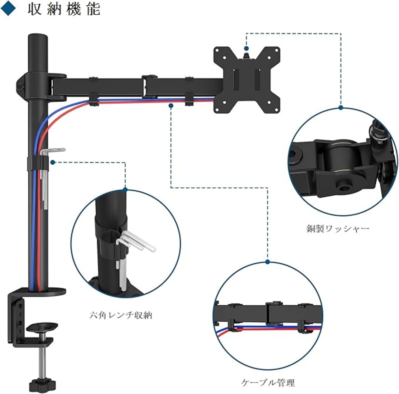 ✔【省スペース】机上スペースの30%を節約できるで、ディスプレイアームにケーブルホルダーが付いているのでケーブルをキレイに配線でき、清潔で整頓された環境で優雅に作業効率向上します;ディスプレイアーム ポールに六角レンチ収納できるホルダーも付いてます。